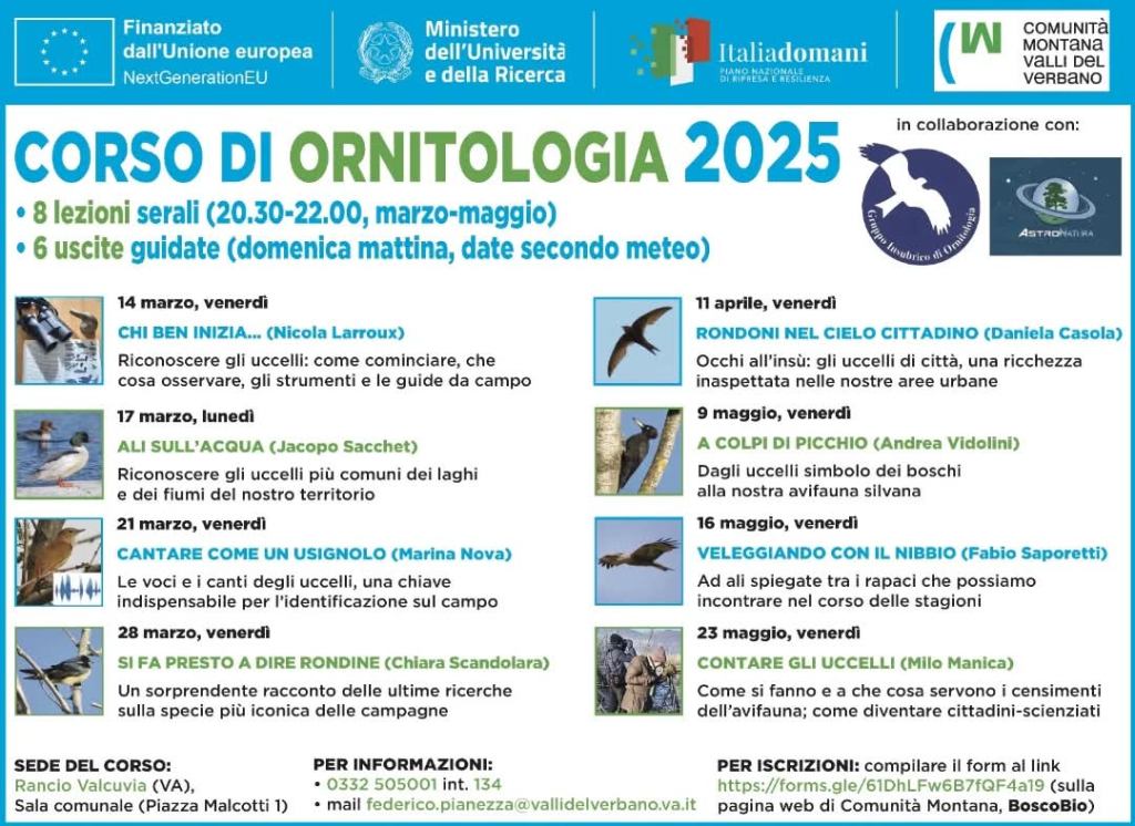 Grazie alla collaborazione con Comunità Montana Valli del Verbano siamo lieti di annunciare il nuovo Corso di Ornitologia che inizierà il prossimo 14 marzo 2025.