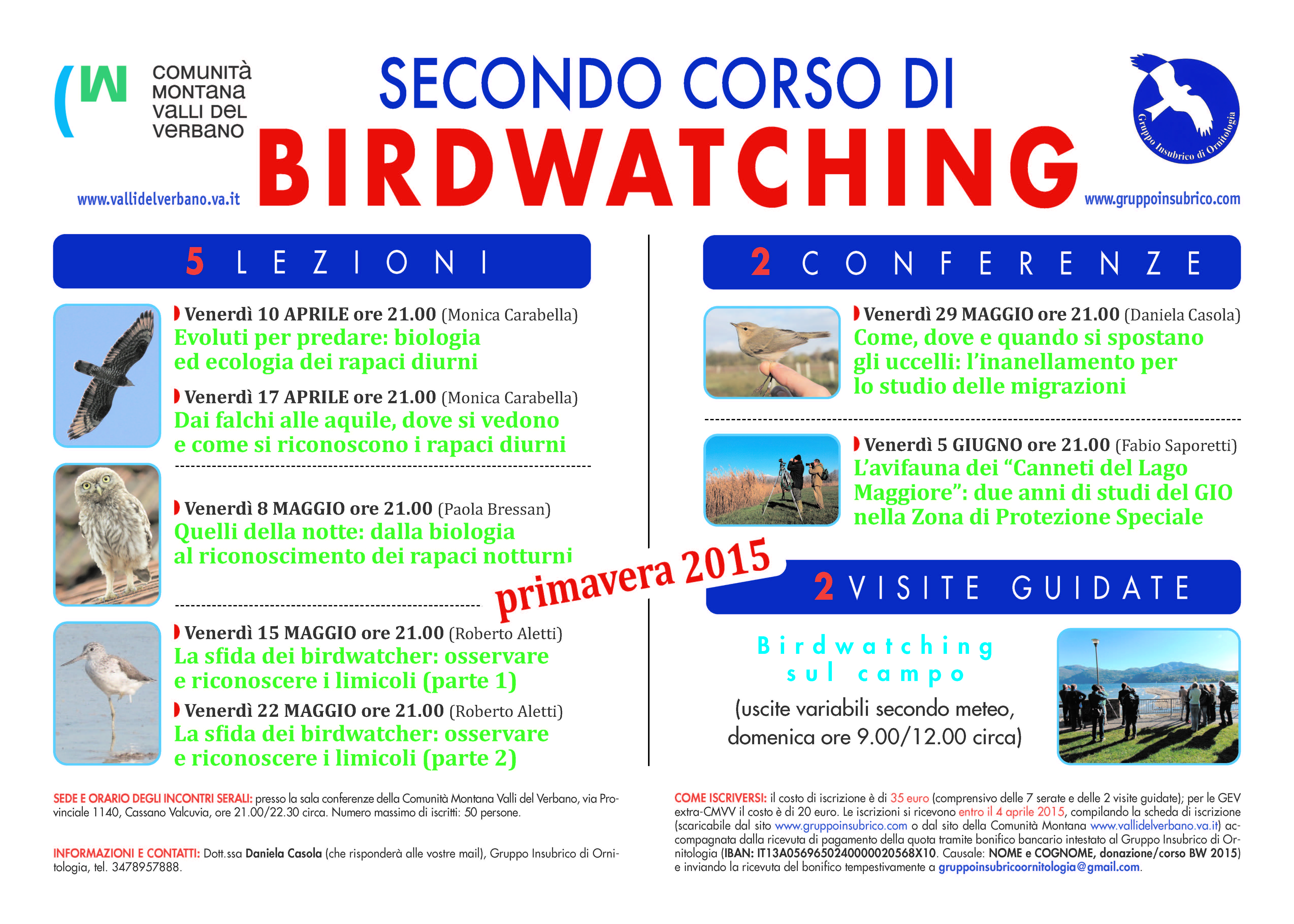 Dopo l’ottimo successo della primavera 2014 riscosso dal “Corso base di Birdwatching”, la collaborazione tra Comunità Montana Valli del Verbano e Gruppo Insubrico di Ornitologia (GIO) prosegue con un’altra carrellata di serate sui temi dell’osservazione e del riconoscimento degli uccelli in natura, a partire dal 10 aprile 2015. Questa volta centreremo la nostra attenzione – ma soprattutto cercheremo di catturare la vostra – con cinque serate (venerdì dalle 21.00 alle 22.30 circa) dedicate prima a due gruppi di specie che da sempre affascinano l’immaginario, i predatori del cielo (dai falchi alle aquile, dagli avvoltoi ai nibbi) e i “signori della notte” (allocchi, gufi, civette&C), quindi ai più sconosciuti e affascinanti “uccelli di ripa” (che noi chiamiamo limicoli, come piro-piro, corrieri, piovanelli, cavalieri ecc.).